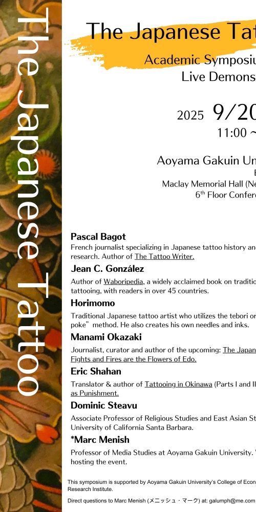 A symposium dedicated to Japanese tattooing will be held on Saturday, September 20, 2025, at Aoyama Gakuin University in the Shibuya district of Tokyo. Among the invited researchers, Pascal Bagot…